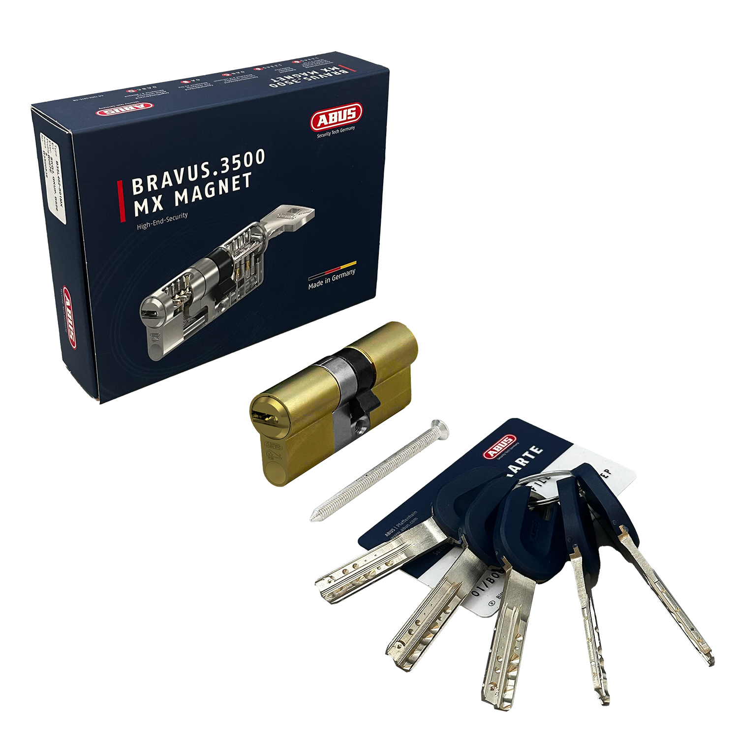 Механизм цилиндровый ABUS BRAVUS 3500 MAGNET 150(70x80) ключ/ключ MX PROCAP PRO MS (5 key) с картой клиента. Трёхрядный, 16-ти пинный, материал корпуса и плага - латунь, ключи мельхиоровые перфо с пластиковыми вставками синего цвета. Цвет - латунь. Максимальная защита от всех наиболее распространённых методов вскрытия и взлома - от манипуляций отмычками, высверливания, вырывания, перелома, свёртыша, бампинга и пикинга. Особенность цилиндров данной серии - дополнительная защита в виде магнитной системы в ключе и корпусе цилиндра, а также механическая система защиты "INTELLITEC" в корпусе цилиндра, блокирующие цилиндровый механизм при попытке вскрытия посторонним ключом. Имеется защита от копирования ключа.