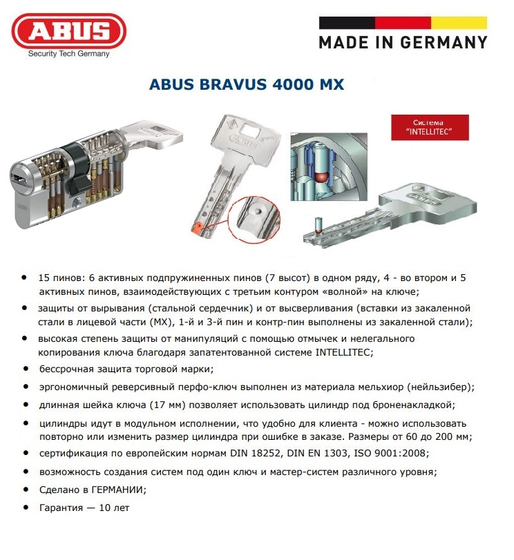 Механизм цилиндровый ABUS BRAVUS 4000 95(50x45В) ключ/вертушка MX PROCAP NI (5 key) с картой клиента. Трёхрядный, 15-ти пинный, материал корпуса и плага - латунь, ключи мельхиоровые перфо с волнообразной фрезеровкой секрета с синими пластиковыми вставками. Цвет - матовый никель. Сторона с вертушкой указана в наименовании маркировкой "B". Мощная защита от наиболее распространённых методов вскрытия и взлома - от манипуляций отмычками, высверливания, перелома, бампинга и пикинга. Особенность цилиндров данной серии - дополнительная защита в виде механической системы "INTELLITEC" в корпусе цилиндра, блокирующей цилиндровый механизм при попытке вскрытия посторонним ключом. Имеется защита от копирования ключа.
