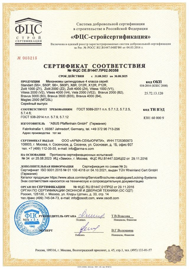 Состав комплекта: механизм цилиндровый - 1 шт., установочный винт - 1 шт., ключи - 5 шт., карта безопасности - 1 шт. Страна происхождения товара - Германия.